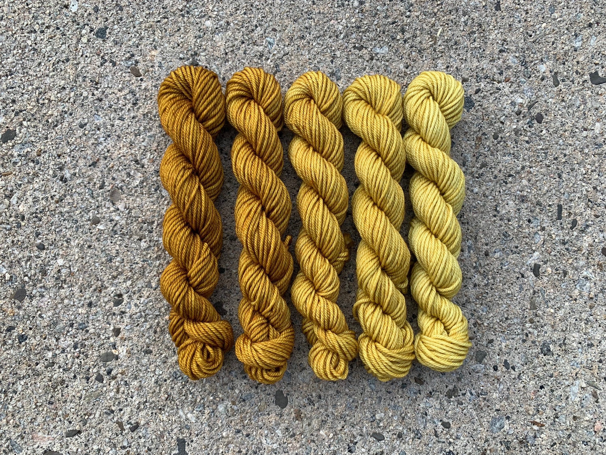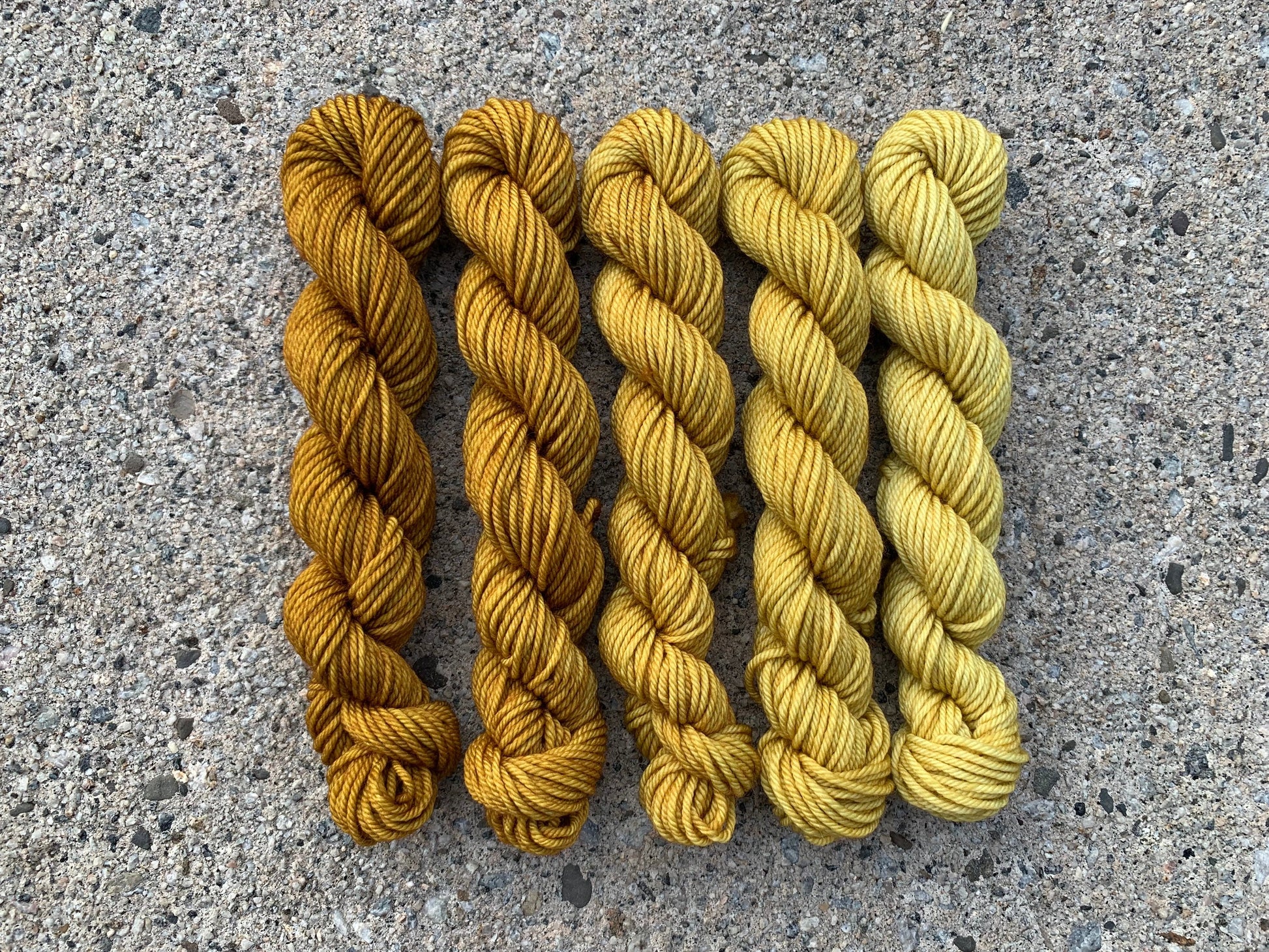 This set includes: five 20g mini skeins in a gradient of saturated, Mustard yellow.
