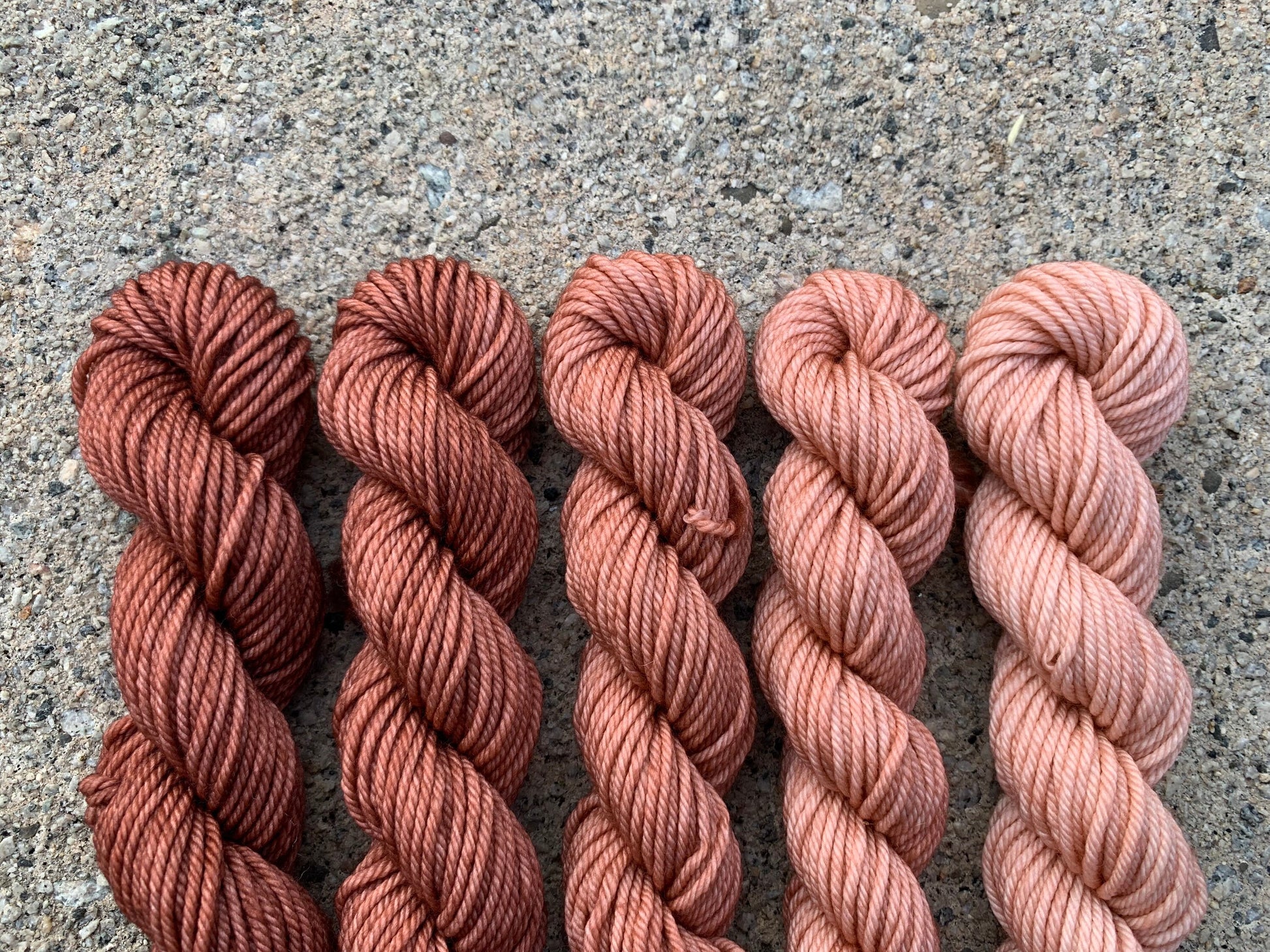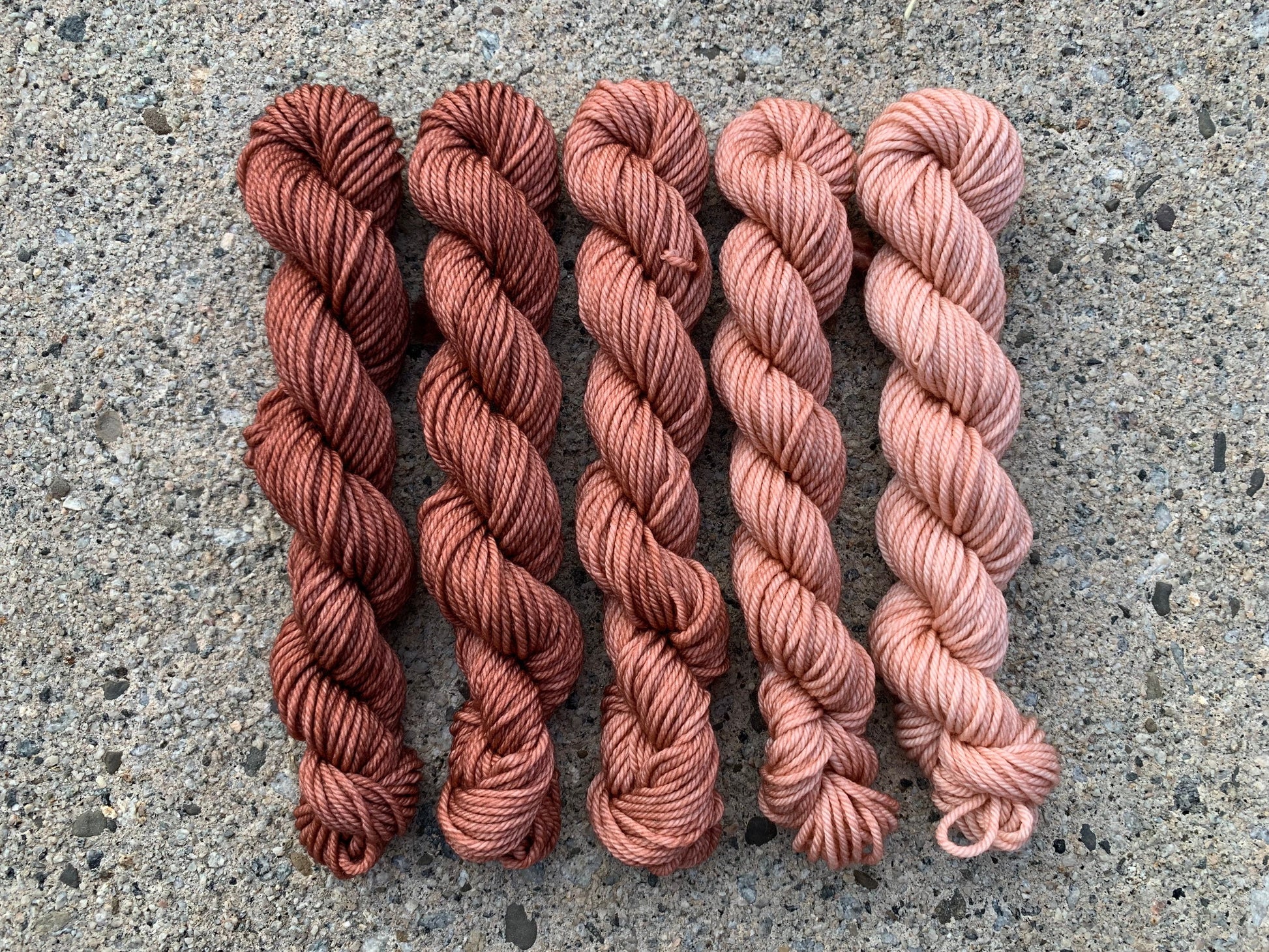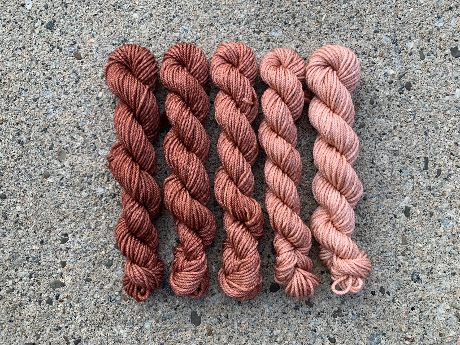 This set includes: five 20g mini skeins in a gradient of dusty, Rose.